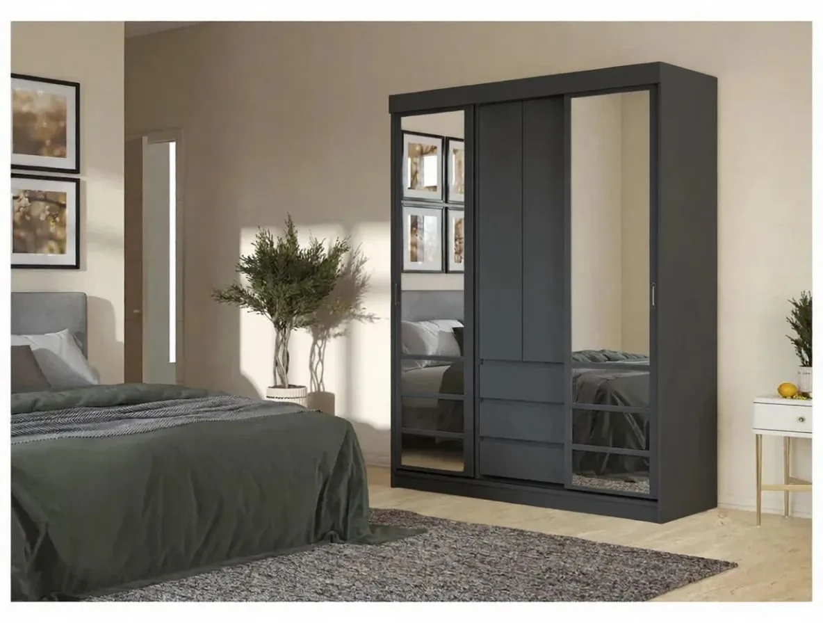 Современный шкаф-купе «Мадера» идеально впишется в любой интерьер благодаря лаконичному дизайну и фасаду из ЛДСП цвета «графит». Новый стандарт удобства – зеркало, три удобных ящика и две штанги слева и справа обеспечивают достаточно места для хранения одежды и аксессуаров. Компактные размеры (1700х2200х600 мм) позволяют рационально использовать пространство вашей комнаты.